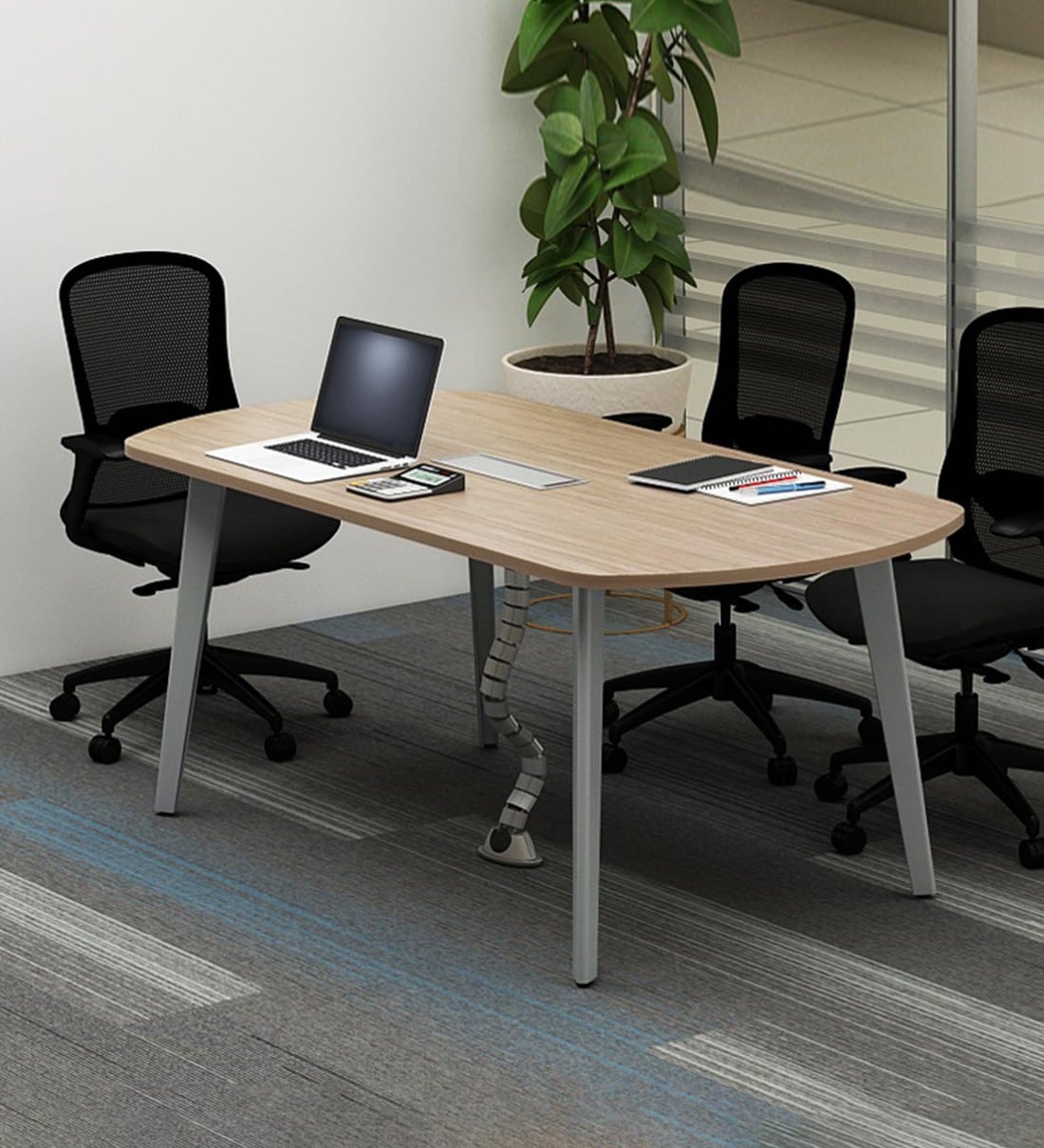 Rectangular Meeting Table Table top made of 25mm thick Engineered Wood and PVC edge banding Designer Legs made of sturdy metal powder coated legs in Silver grey powder coated finish Vertebrae for table to floor wire carriage Access Flap for easy wire management