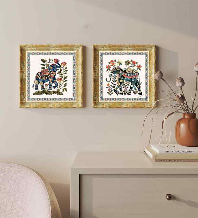 (Pack Of 2) Blue Fibre Floral Elephant Wall Art Panels