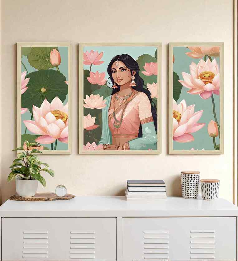 Art Street Indian Women and Lotus Digital Wall Art is a lovely set of 3 framed paintings that add elegance and tradition to any room. You get 1 big painting (33x44 cm) and 2 medium ones (22x46 cm), digitally printed on 250 GSM matt laminated paper. Each painting is framed with engineered wood, backed by sturdy MDF, and comes with strong metallic hardware for easy hanging just unpack and hang without any extra effort. Perfect for living room, bedroom, hallways, or office d cor. Also a great gifting option for housewarmings, weddings, festivals, or birthdays to bring art and culture to your loved ones homes.