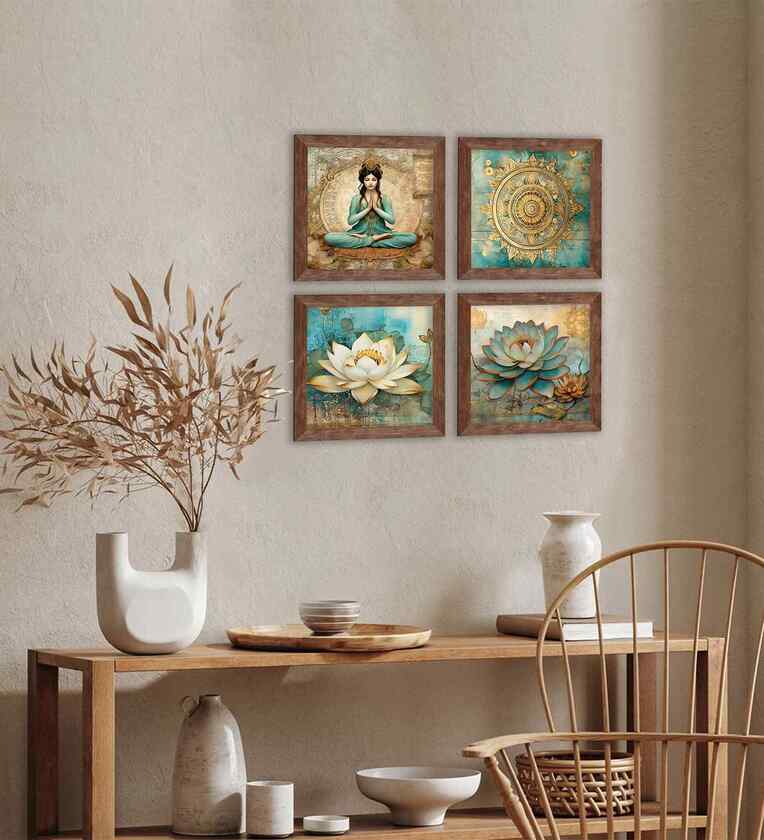 (Pack Of 4) Gold Fibre Lotus Floral Wall Art Panels