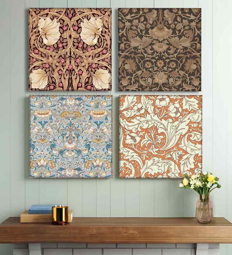 Add elegance and charm to your space with this set of 4 symmetrical canvas frames featuring a stunning blend of Morris & floral patterns. Designed for contemporary and classic interiors alike, these digital reprint paintings come beautifully printed on high-quality canvas and mounted on sturdy frames. Whether for your living room, bedroom, hallway, or even hotel suites, this set serves as a tasteful and timeless d cor upgrade. Each frame measures 12 x 12 inches, making it the perfect size to create a cohesive visual statement.