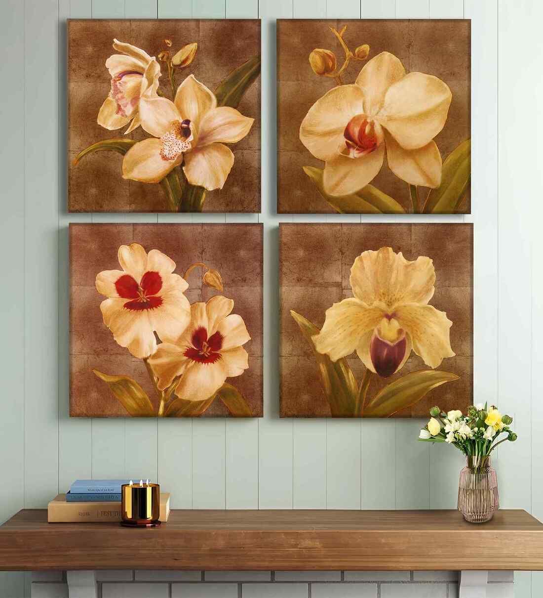 Elevate your interior d cor with the graceful beauty of orchids through this exquisite set of 4 digital reprint canvas frames. Each 12x12 inch artwork features delicately detailed orchid floral designs, bringing a sense of luxury, calm, and sophistication to your walls. Whether you're decorating a cozy bedroom, a stylish living room, or a serene hotel space, these high-quality canvas prints add timeless charm and natural elegance. Printed on premium fade-resistant canvas and mounted on strong wooden frames, this set is ready to hang and enjoy.