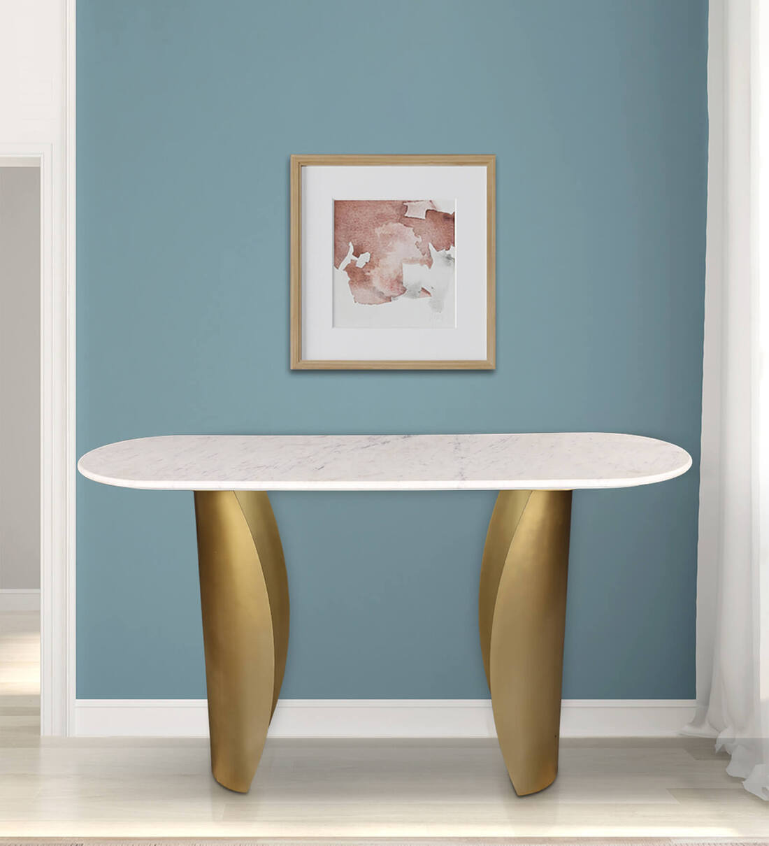 The table's top comes with thick Top Marble Panel, known for its quality and luxury. The table's legs are made of golden metal with a curved and elegant design at the bottom.