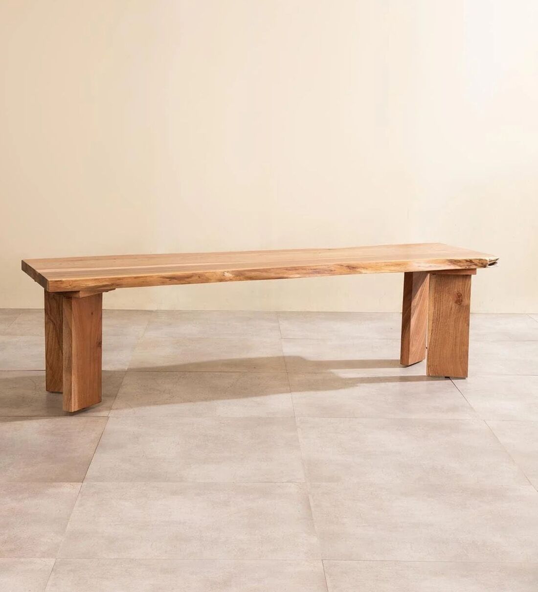 A live edge seat rests upon the asymmetrical legs of our acacia wood Palisaded Bench to bring a contemporary edge to everyday seating. The blend of organic form and bold geometry creates a sculptural accent perfect for pairing with a dining table or standing alone in an entryway or living space
