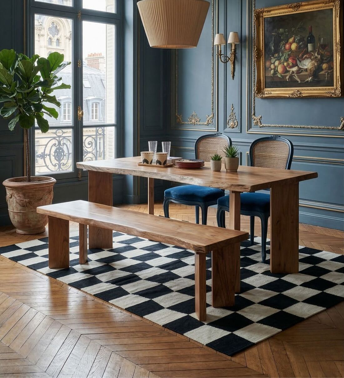 A live edge top rests upon asymmetrical legs of our acacia wood Palisaded table to bring a contemporary twist to everyday dining. The combination of the organic surface and linear structure create a striking geometric centerpiece with which to enjoy family meals and entertain for years to come.
