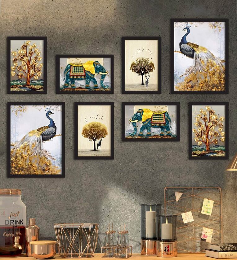 Paper Framed Royal Animals & Peacock Black Set Of 8 Art Print