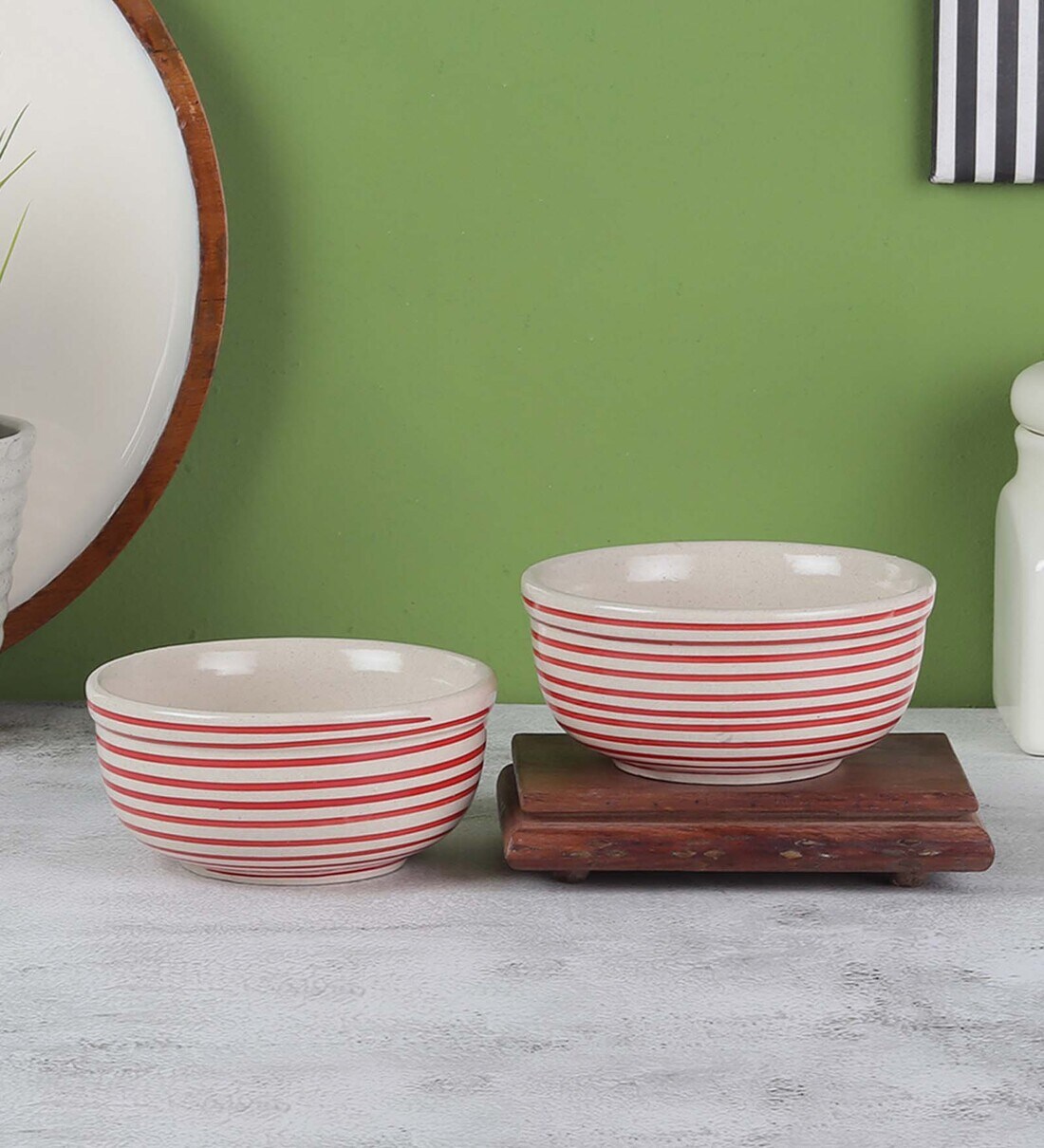There is something deeply satisfying in most circular patterns and design visuals. The cicrumference or circle has also been used in various art and craft forms since ancient times in several religious and sects. In Sanskrit, Parikrama means "the path surrounding something". Typically, in Indic-religions the parikrama is done after completion of traditional worship (puja). Taking inspiration from the natural form of a never ending line, comes this beautiful spiral collection from VarEesha - Parikrama. The series includes a number of dinnerware,serve-ware, storage and bath accessories. It comes in two colors that match most decor styles and themes. Noteworthy is the effort and steadiness it takes to build each piece by hand and then hand paint the circular patterns still maintaing the spacing and shading. The pieces have also been designed keeping in mind practical utility and thus are dishwasher and microwave safe (without the wooden parts). Lead free and Non toxic, they are hygeinic and a healthy choice. Parikrama Red Spiral Medium Ceramic Serving Bowls Set is a part of this series that has two pieces, each measuring 6x2.5 inches in dia x h and with a capacity of 350 ml. Unique and eye catching, this can be a wonderful gift too.