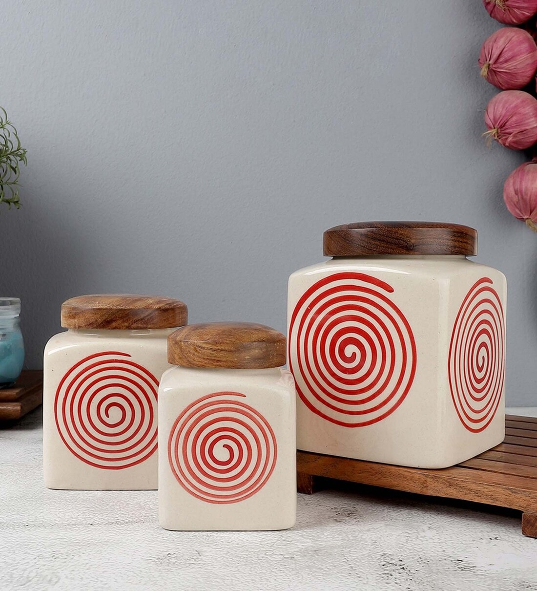 There is something deeply satisfying in most circular patterns and design visuals. The cicrumference or circle has also been used in various art and craft forms since ancient times in several religious and sects. In Sanskrit, Parikrama means "the path surrounding something". Typically, in Indic-religions the parikrama is done after completion of traditional worship (puja). Taking inspiration from the natural form of a never ending line, comes this beautiful spiral collection from VarEesha - Parikrama. The series includes a number of dinnerware,serve-ware, storage and bath accessories. It comes in two colors that match most decor styles and themes. Noteworthy is the effort and steadiness it takes to build each piece by hand and then hand paint the circular patterns still maintaing the spacing and shading. The pieces have also been designed keeping in mind practical utility and thus are dishwasher and microwave safe (without the wooden parts). Lead free and Non toxic, they are hygeinic and a healthy choice. Parikrama Red Spiral Square Ceramic Jars Set has three pieces, measuring 4x4x5, 3.5x3.5x4 & 3x3x3.5 inches in l x b x h. They have a capacity of 800, 450 & 200 ml respectively. These are spill proof and keep your contents fresh.
