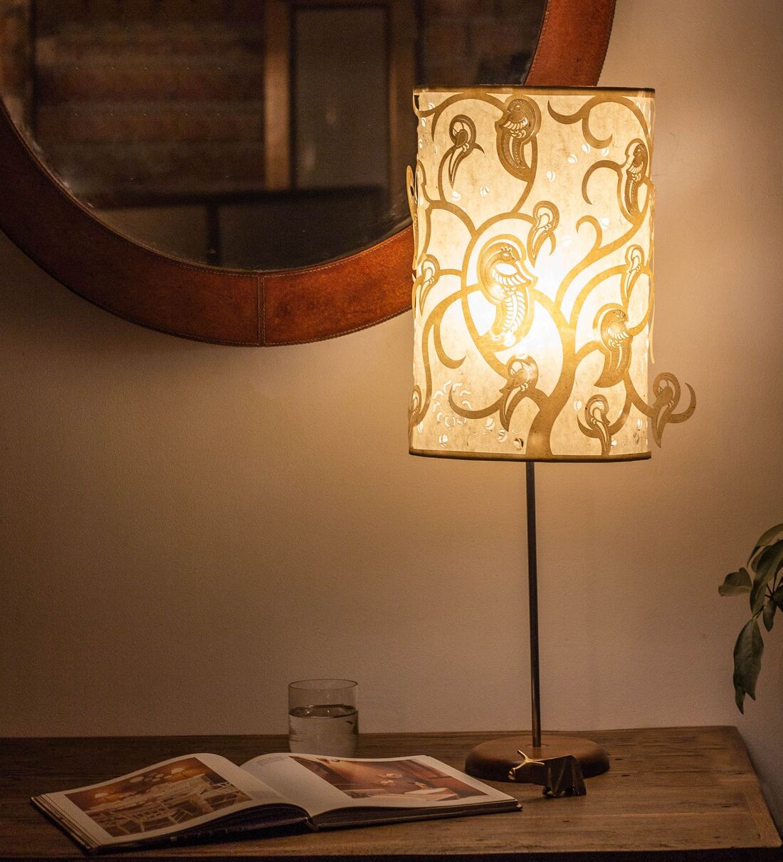 Mesmerising shadow puppetry brought to life in a table lamp, handcrafted from lokta and banana fibre paper with laser cut parrots, on a teak wood/ stone base. Ideal for any cosy enclave in residences and hospitality spaces.