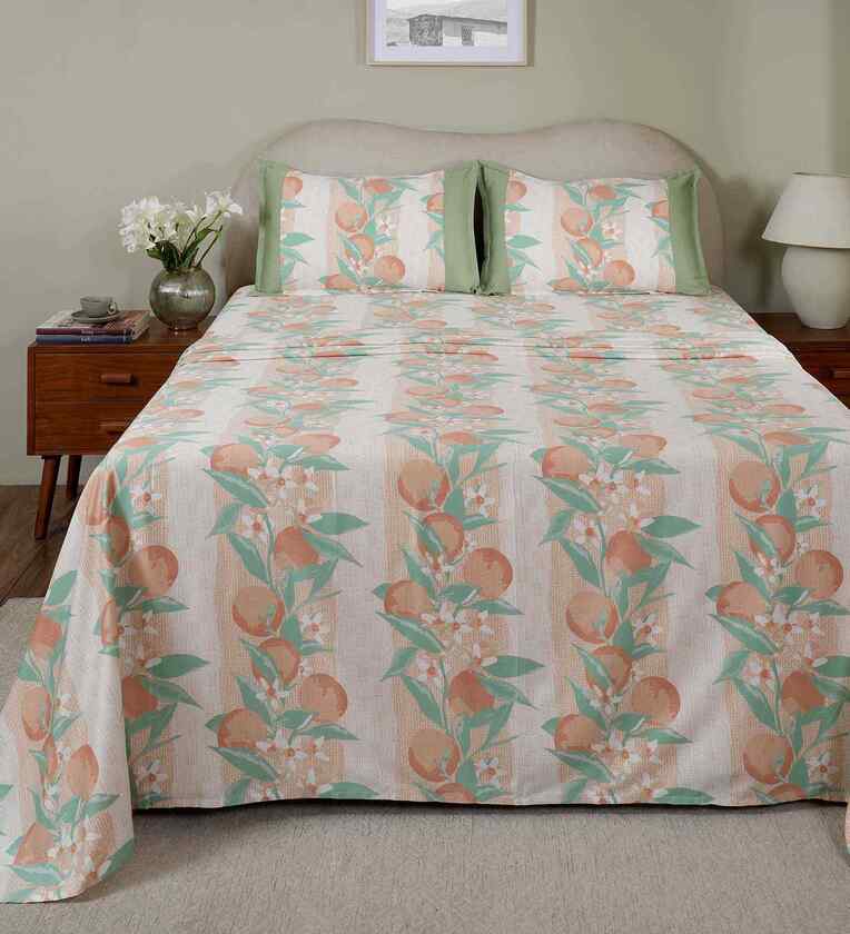 Peach Fruit Print 200 TC Cotton Single Bed Sheet with 1 Pillow Cover Sensory Bloom Collection