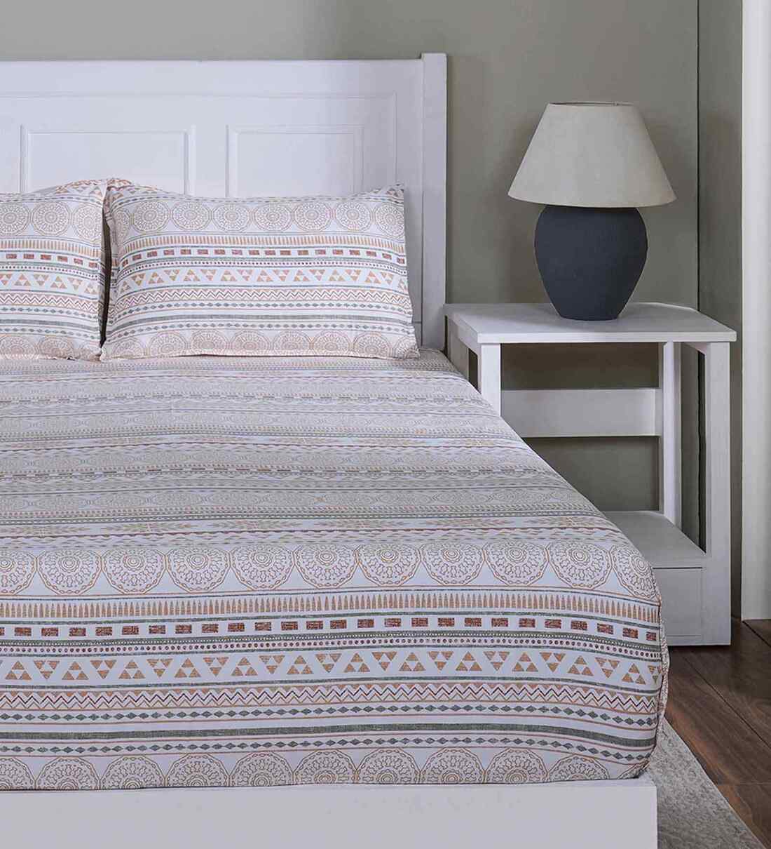 Peach Geometric Print 144 TC Cotton Double Bed Fitted Sheet with 2 Pillow Case Sensory Bloom Collection
