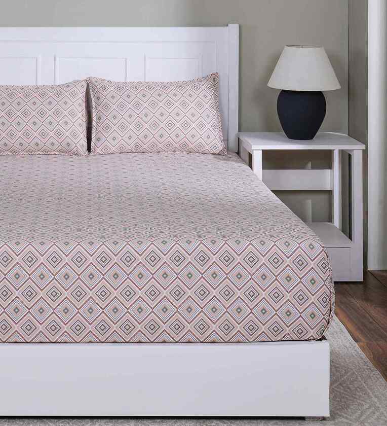 Peach Geometric Print 144 TC Cotton Double Bed Fitted Sheet with 2 Pillow Case Sensory Bloom Collection