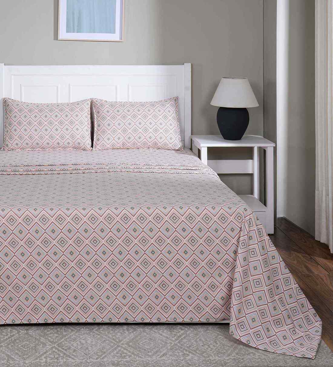 Peach Geometric Print 144 TC Cotton King Size Bed Sheet with 2 Pillow Covers Sensory Bloom Collection