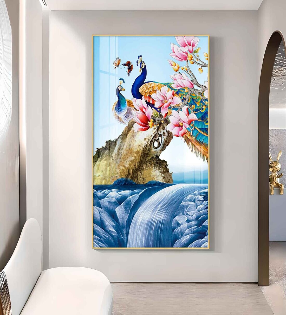 Peacock Amidst Floral Waters Glass Finish Vertical Wall Art