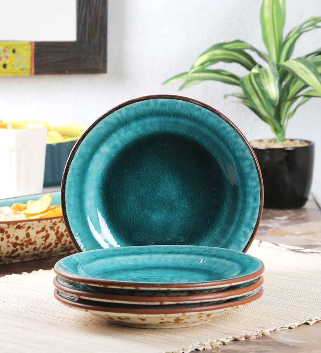 VarEesha brings a Color Tones collection of serve ware and crockery that will enhance your dining collection further bringing in a classy look to it. Made of ceramic, each of these is hand crafted uniquely by rural artisans. Peacock Green Hand Painted Mosaic Ceramic Quarter/ Side Plates is a part of this shaded hand crafted collection. The unusual green shade with brown sprinkled contrasting outer pattern is sure to add oodles to your decor charm. The set contains 4 plates, each measuring 7x1 inches in diaxh and microwave safe. Being hand made, slight variation in shades and size could be there adding to its natural design.