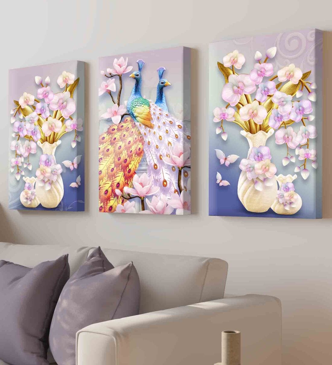 Peacock Multicolour Engineered Wood (Set of 3) Art Panels