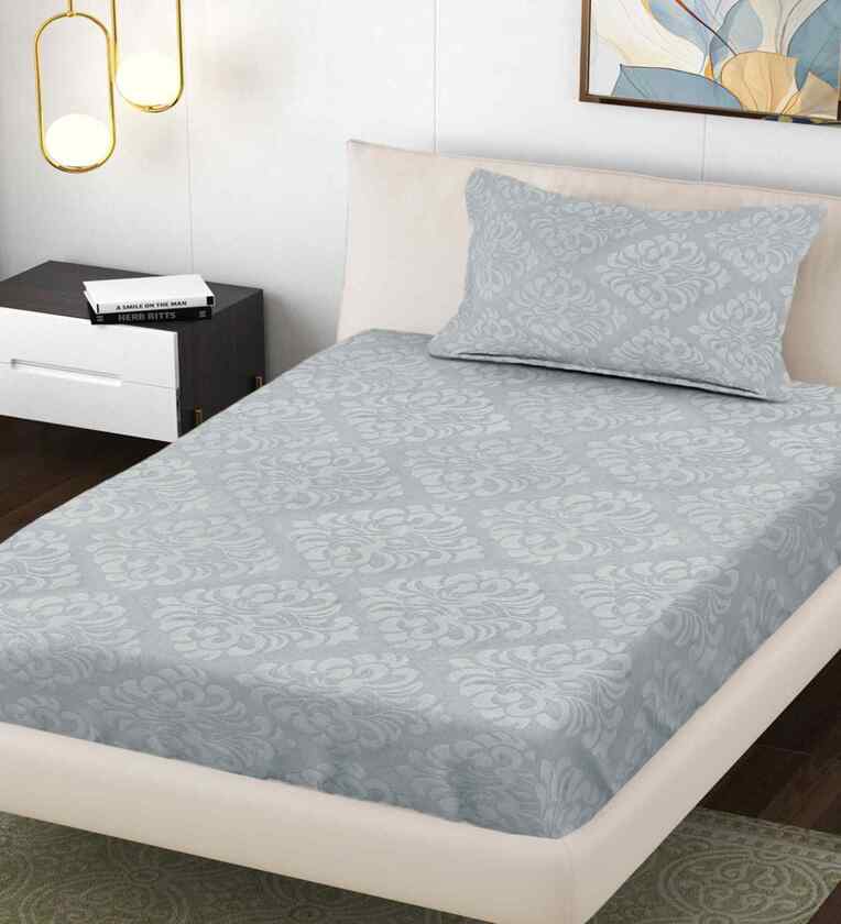 Pearl Grey Ethnic 300 TC Cotton Blend Embossed Single Bedsheet with 1 Pillow Cover