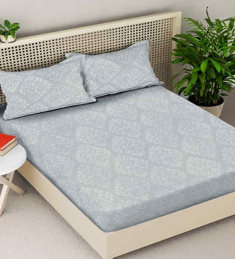 Pearl Grey Ethnic 300 TC Cotton Blend King Size Fitted Embossed Double Bedsheet with 2 Pillow Covers