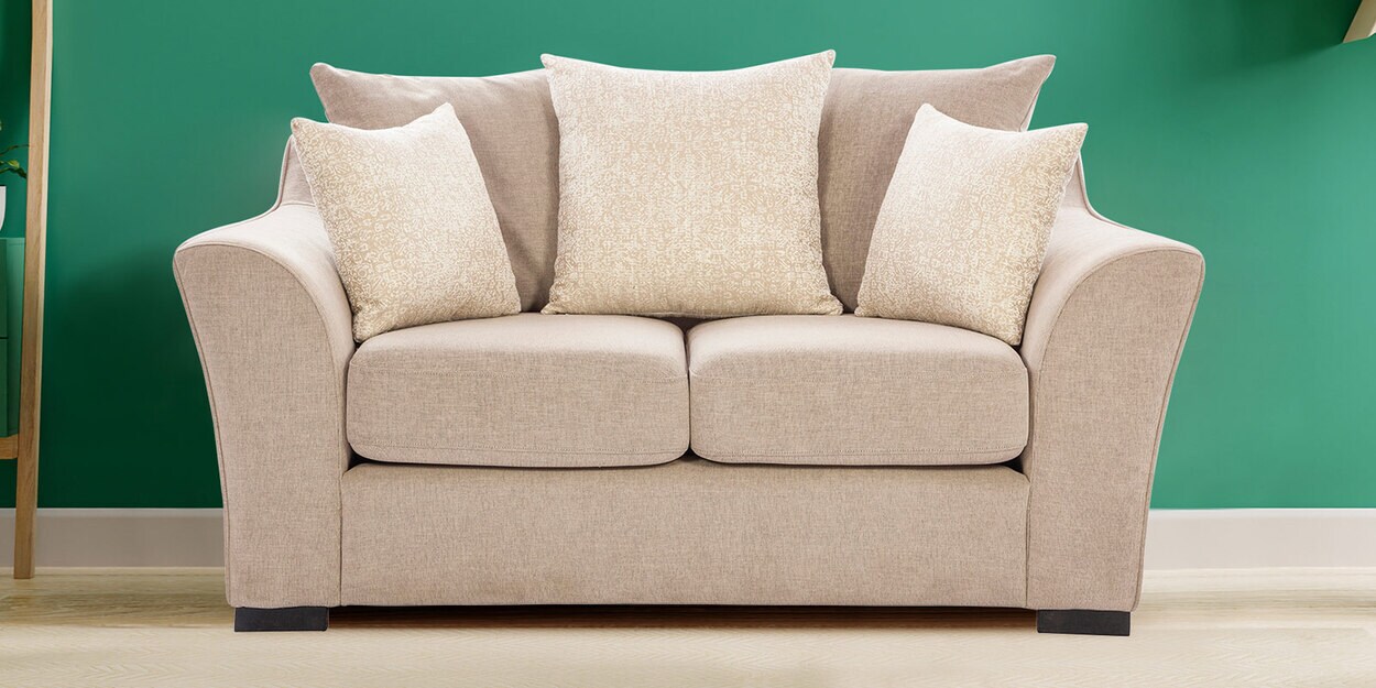 A plush Box cushion design gives sink in comfort for relaxed seating The contrast coloured Throw Pillows add oomph to this statement piece Other Highlights- Wooden sleek legs Colour and Size options- Available first time ever in extended 3 seater size for plush seating Also available in 2 Seater and Arm Chair Available colours in Sofa - Beige