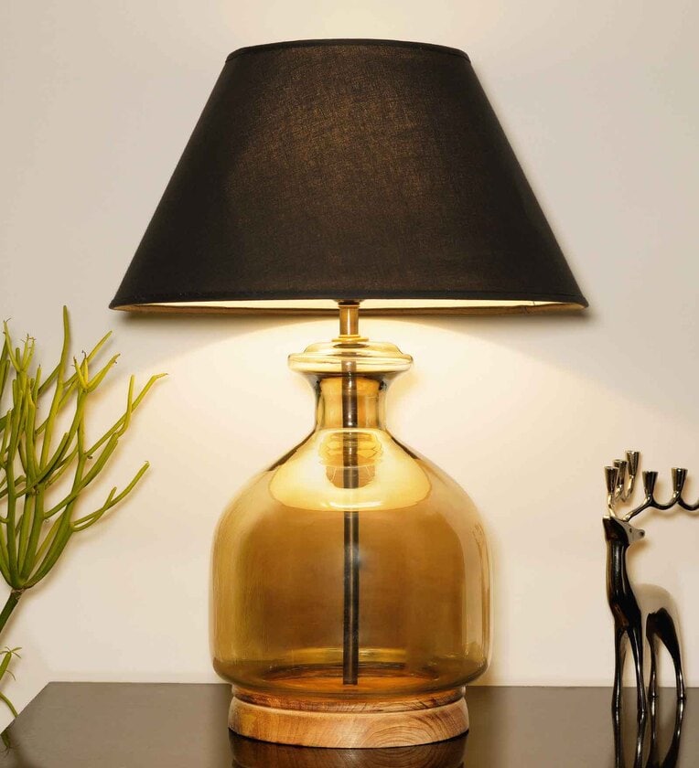 Petunia Black Cotton Shade Night Lamp With Glass & Wood Base