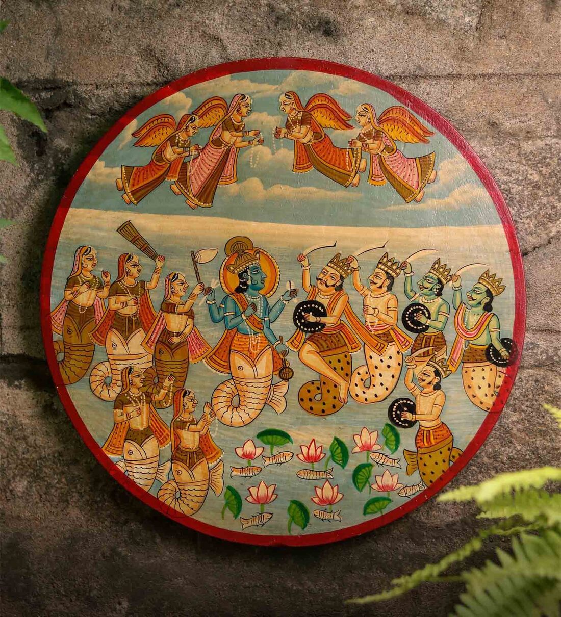 Design a magical story of heritage India on your favorite wall. Our local artisans from Rajasthan are celebrating authenticity of Pichwai Art on Wooden Wall Panels.Pichwai is centuries old rich heritage of Rajasthan depicting beautiful stories of Lord Ganesha. Embrace this bespoke collection at your beautiful home !!! Shop a Story !!! Usage Recommendation : as wall decor, table decor (Indoor purpose) Material : Wooden Size : 16" DiaWall Panal comes with a standard hook hole at the back side to hang on the wall with ease. Disclaimer : Handmade & Handpainted products may have minute imperfections and insignificantly different from each other which make them unique & special. Let's embrace the beauty !!!