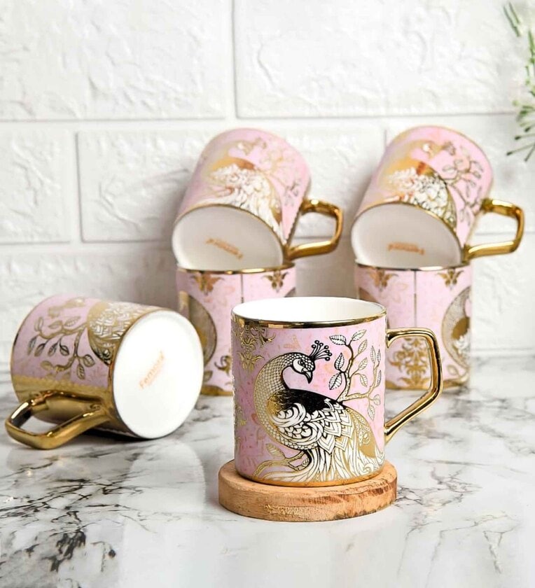 Pink 180 ml Ceramic Peacock (Set of 4) Tea Cup Set