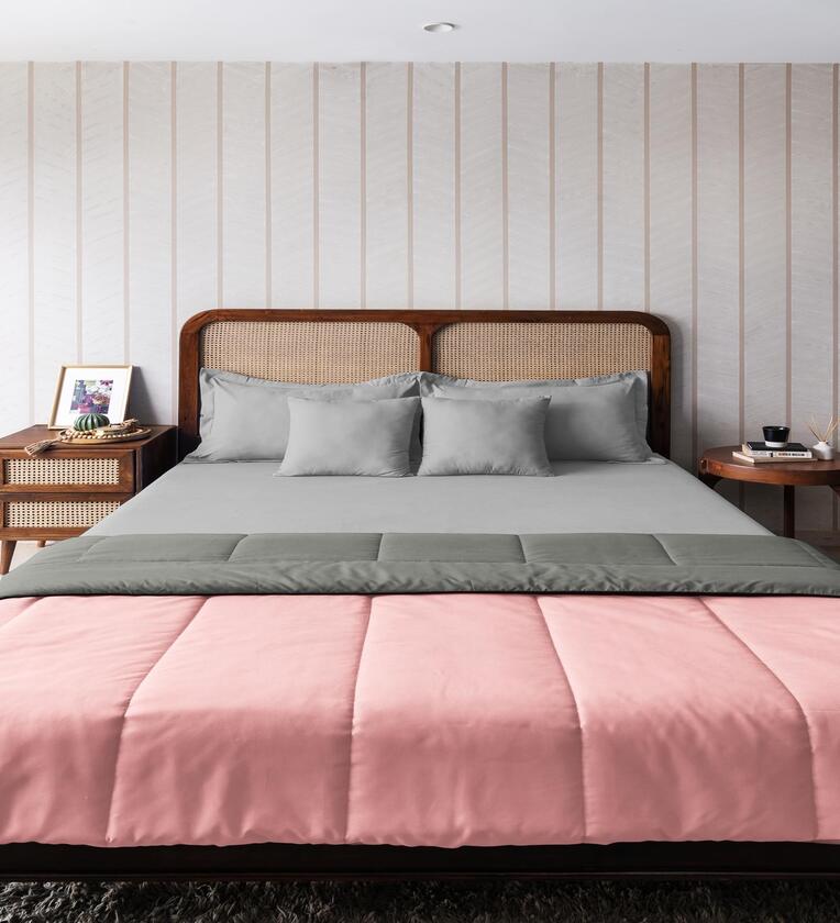 The EasySnug solid reversible comforters by THE HAPPY POD combine sophistication and comfort in a single package. Filled with 150 GSM HEXAREL fiber, these comforters feature thermoregulating graphene technology to ensure year-round comfort and warmth. The reversible design offers two chic looks, while the elegant piping along the edges adds a refined touch. Encased in ultra-soft microfiber, these comforters provide a cozy and luxurious feel. They come in a stylish, reusable storage bag, making them both practical and elegant for your bedroom.
