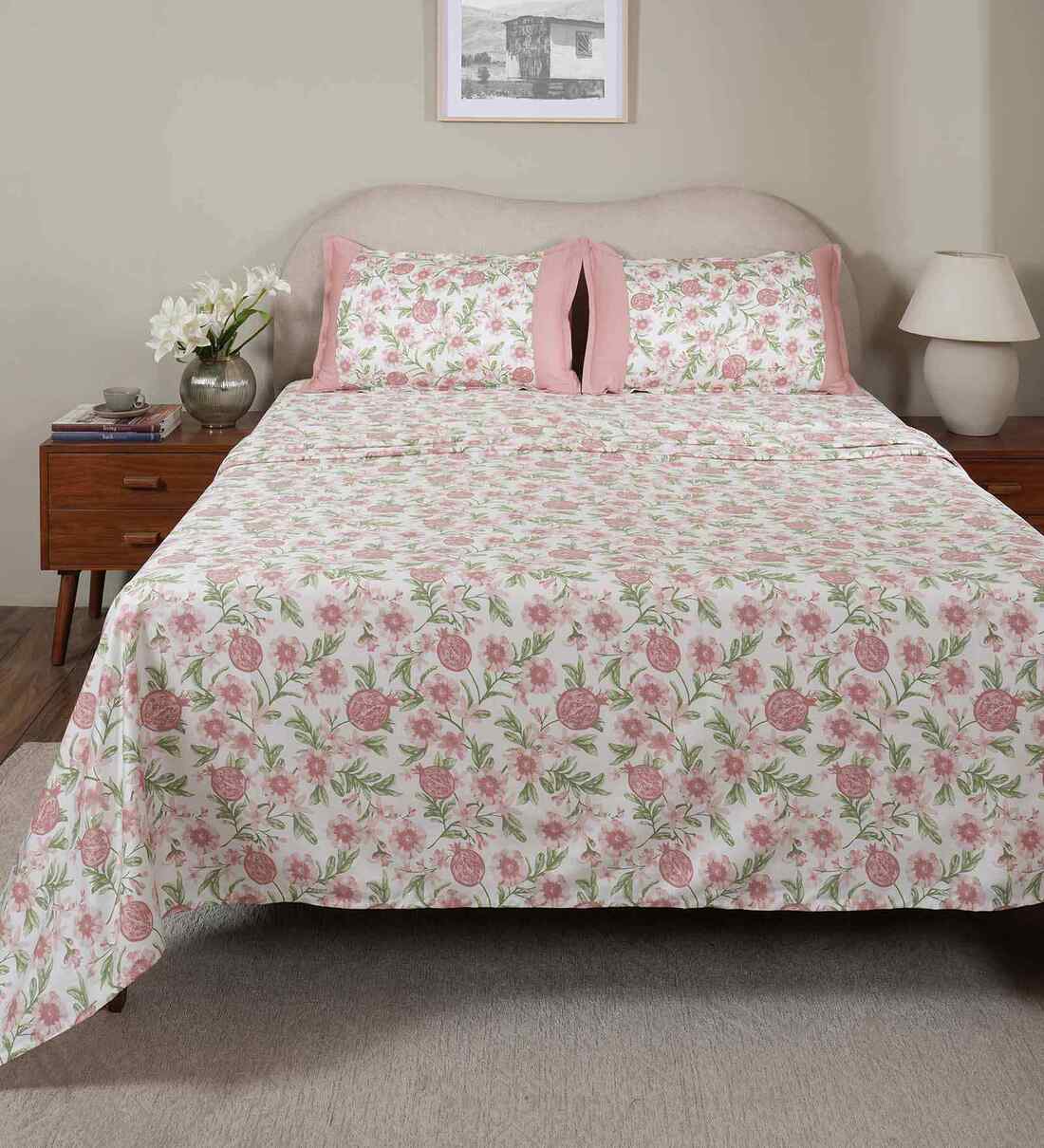 Pink Fruit Print 200 TC Cotton King Size Bed Sheet with 2 Pillow Covers Sensory Bloom Collection