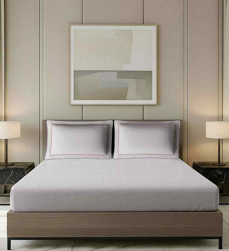 Pink Solid Pink With Geometric Embroidery 1400 TC Cotton King Double Bedsheet With 2 Pillow Covers