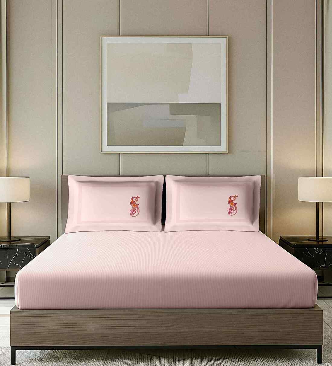 Pink Striped Bedsheet With Solid, Embroidery Pillows 800 TC Cotton King Double Bedsheet With 2 Pillow Covers