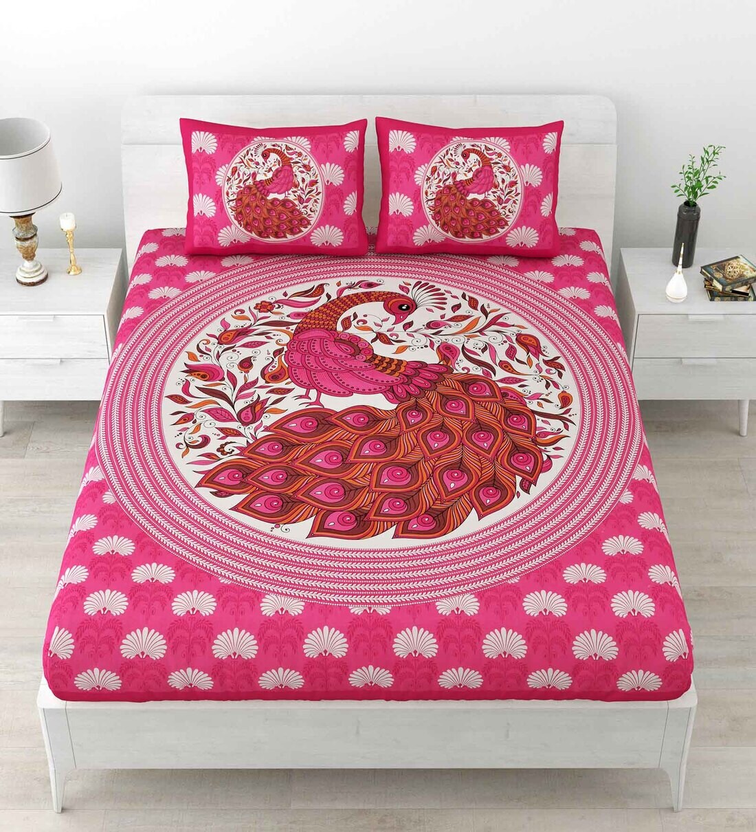 Pink Traditional 120 TC Cotton Queen Sized Bedsheet with 2 Pillow Cover