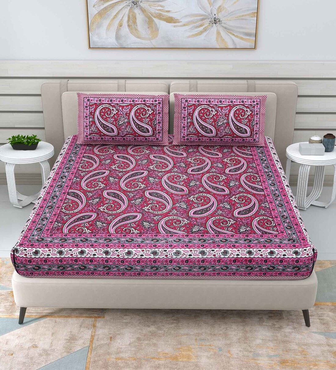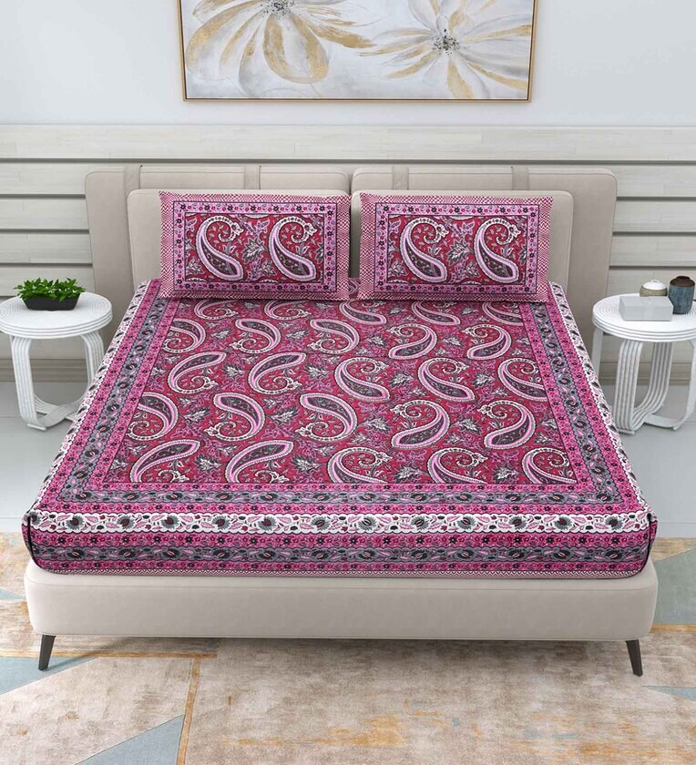 Pink Traditional 144 TC Cotton Double Queen Bedsheet With 2 Pillow Covers