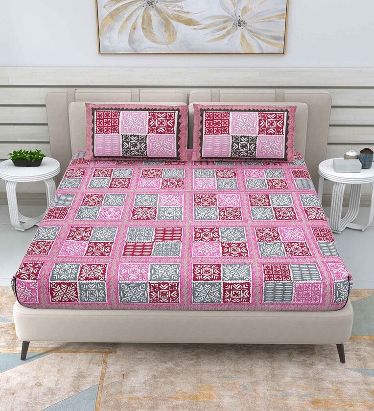 Pink Traditional 144 TC Cotton Double Queen Bedsheet With 2 Pillow Covers