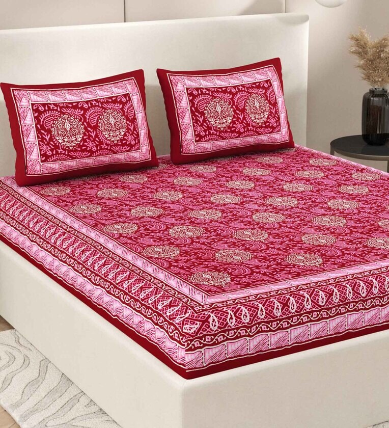 Pink Traditional 200 TC Cotton Double Queen Sized Bedsheet With 2 Pillow Covers