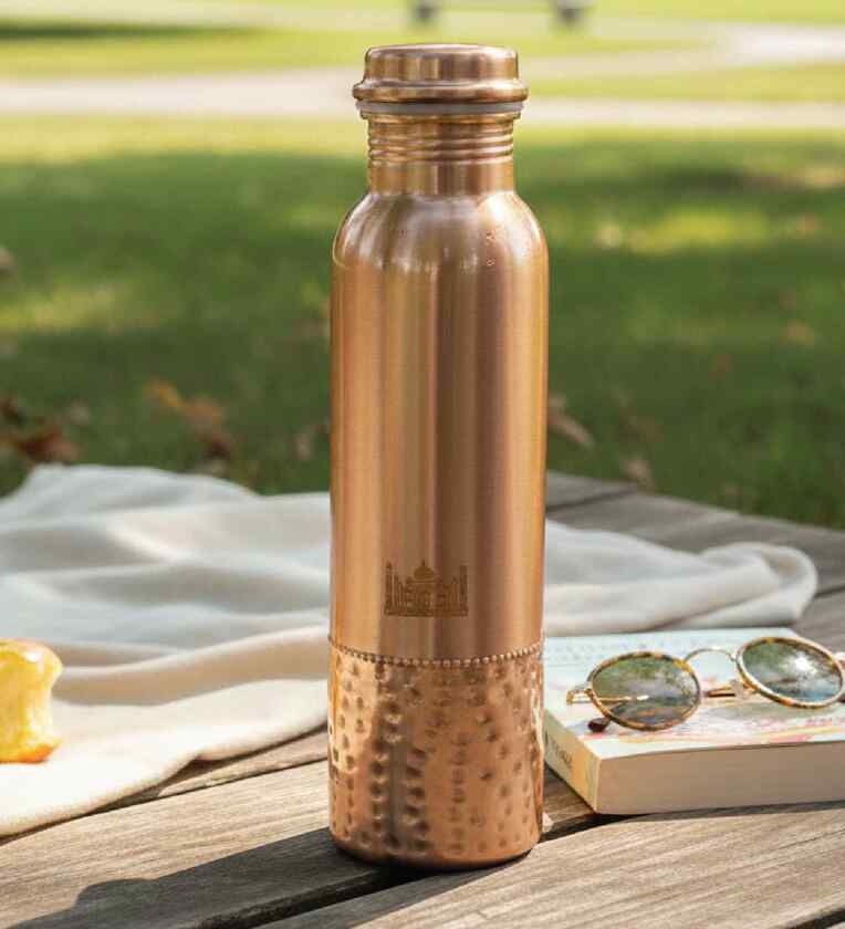 Experience the perfect fusion of heritage, health, and elegance with the Maatir Beaten Copper & Etched Taj Mahal Large Water Bottle. Crafted from 100% pure copper, this bottle is more than just a container it s a lifestyle choice. Inspired by the timeless beauty of the Taj Mahal, the etched design and hammered texture make this bottle a work of art while offering the wellness benefits of copper.