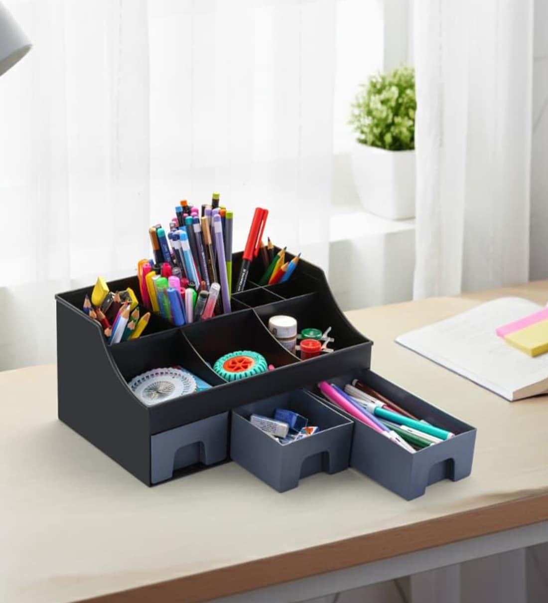 Upgrade your workspace with this ABS plastic desk organizer with drawer, designed to keep your office desk, home table, or study area neat and clutter-free. With dedicated compartments for pens, pencils, markers, sticky notes, stapler, scissors, clips, and business cards, this all-in-one organizer ensures you never waste time searching for essentials again. Crafted from premium-quality ABS plastic, the UCRAVO desk organizer is lightweight, strong, waterproof, and long-lasting. Its sleek matte black finish adds a professional touch to your office d cor while offering scratch resistance and dust protection, making it suitable for daily use in home, school, or office environments. This desktop stationery organizer with drawer helps you maximize desk space while keeping all your supplies easily accessible. The built-in sliding drawer provides hidden storage for smaller accessories like USB drives, sticky note pads, erasers, or paperclips, helping maintain a clean, organized, and productive workspace. More than just a stationery holder, this multifunctional desk organizer is ideal for storing makeup brushes, remote controls, craft supplies, or small tools. Whether you are a student preparing for exams, a professional managing office files, or someone working from home, this organizer keeps everything in one place. A stylish yet practical accessory that transforms any desk, study table, or office workstation into an efficient, organized space.
