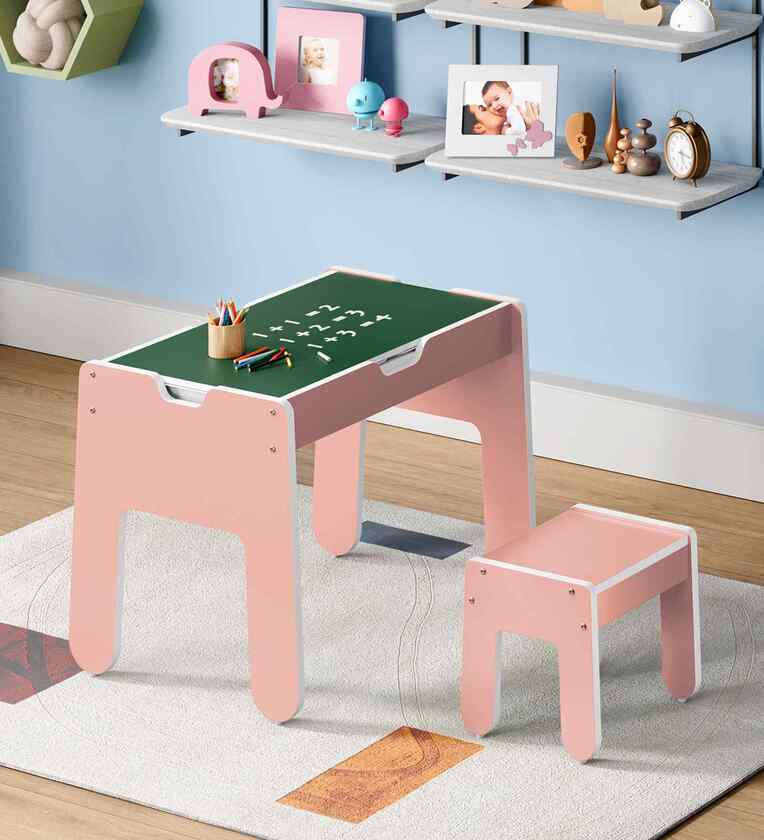 The Alex Daisy POP Activity Table and Seat Set is a versatile furniture set designed to provide children with a perfect space for reading, drawing, playing, eating, and having fun. It can be placed in various rooms, such as the bedroom, playroom, or living room, making it a convenient addition to your home. Constructed with engineered wood, it offers solid support and durability, ensuring it will last for years. The table top is reversible, with one side being a chalkboard and the other a whiteboard. Underneath the tabletop, there are two big-sized plastic containers to store your child s drawing accessories, toys, books, or stationery. A Whiteboard Marker, Duster Cap, and multicolour chalks come FREE with it. The height of the table and seat is designed to give young children a sense of independence and control, encouraging them to explore and learn in a safe environment. Assembling the set is easy, allowing you to provide your child with a comfortable and engaging space without any hassle. At Alex Daisy, we aim to make safe and high-quality children's furniture affordable for all families. We understand that safety is the most important factor when it comes to your child's space. That's why all Alex Daisy children's products are made with long-lasting materials to ensure they can withstand years of jumping and playing, instilling resilience and durability. Additionally, they are rigorously tested to meet or exceed all industry safety standards, providing peace of mind for parents. The product's surface is scratch-resistant lamination in everlasting colours, and there is no paint used in the product's construction, promoting sustainability and eco-friendliness. AMAZING GIFT FOR YOUR LITTLE ONES: Looking for the perfect space to enhance your children's creativity? Look no further than this table and chair set! Ideal for various activities such as crafts, drawing, playing, and even studying, this set comes with a desk and stool in vibrant colours. It is recommended for boys and girls aged three years and above. BIG SPACE: This table measures approx. 2ft. x 1.7ft. and offers ample space for your little ones to indulge in a range of activities - be it crafting, playing board games, drawing or studying. Underneath the tabletop, there are two big-sized plastic containers to store your child s drawing accessories, toys, books, or stationery. REVERSIBLE DWARING BOARD: The table top is reversible, so it can be used as a canvas for children to sketch their imaginations or solve math problems. One side can be used as a chalkboard, and the other as a whiteboard. A Whiteboard Marker, Duster Cap, and multicolour chalks come FREE with it. DURABLE: Made of strong engineered wood with scratch-resistant surface. The joinery is steel Allen bolts, so there is no chance of parts getting loose. Moreover, the chair comes with plastic buffers to prevent any scratches on your floor and make it easy to move around. Quality-engineered wood boosts the bearing capacity, giving kids a stable surface to work as they grow. QUICK SERVICE SUPPORT: This is a DIY (Do It Yourself) product. It comes with an instruction booklet on how to assemble the table and seat, as well as a video link for visual assistance. Alternatively, if you require a technician to assemble it, you can contact Alex Daisy's service support for a fee. Alex Daisy's service support can be connected via WhatsApp at 98739-92500. We are always happy to help you.