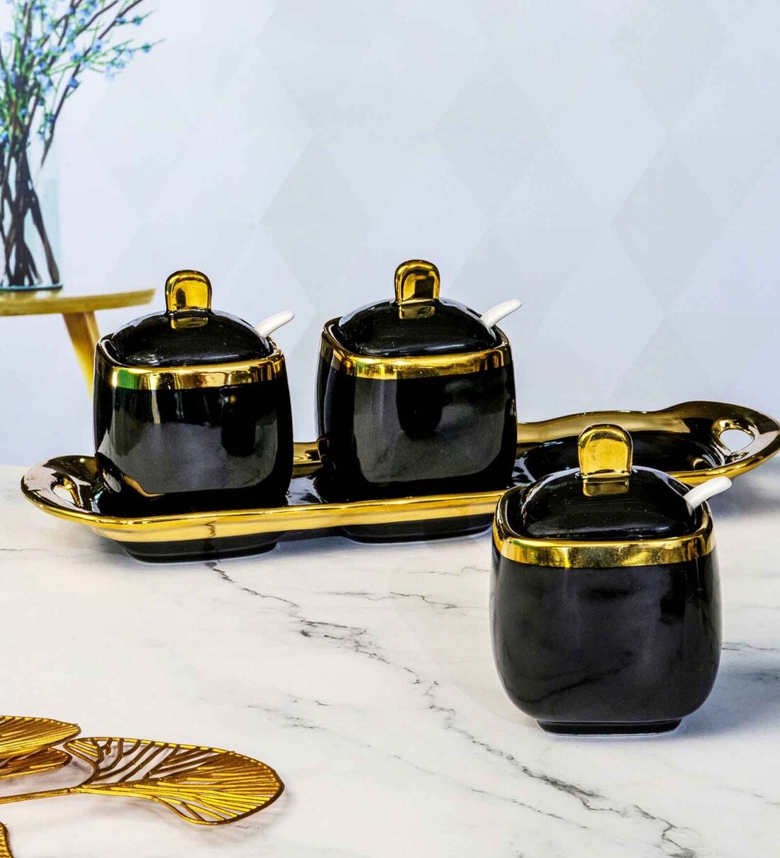 Ready to hold all those essential nibbles for your family and friends to pick through the days and evenings, our nut bowl set with a Wooden stand is sure to liven up your parties. Each piece is crafted from high quality porcelain and a golden border, is filled with oodles of charm that effortlessly combines art and functionality. You can fill the bowls with nuts or nibbles and it will be a statement centrepiece for all your parties.