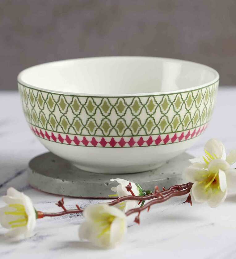 Premium 240ml White & Green Ceramic (Set of 6) Dinner Bowl