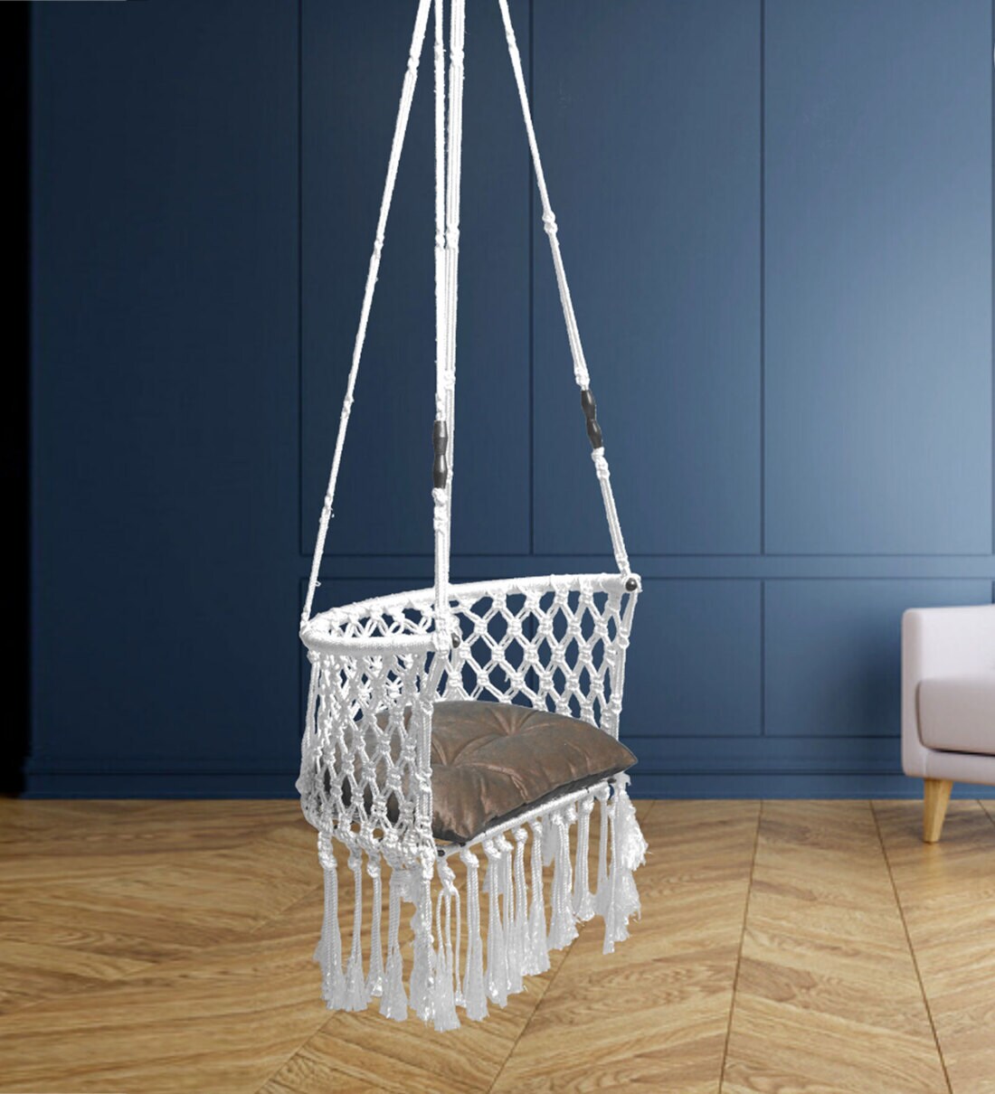 Built with strong and durable polyester rope with extra thickness for maximum stability and comfort, the entire swing measures at Back Support: 28 Inches, Breadth: 18 Inches, Full Height: 60 Inches, Weight-bearing capacity 150 Kgs, Color: White Swing with Brown D Shape Cushion, Swing Shape: C Shape.