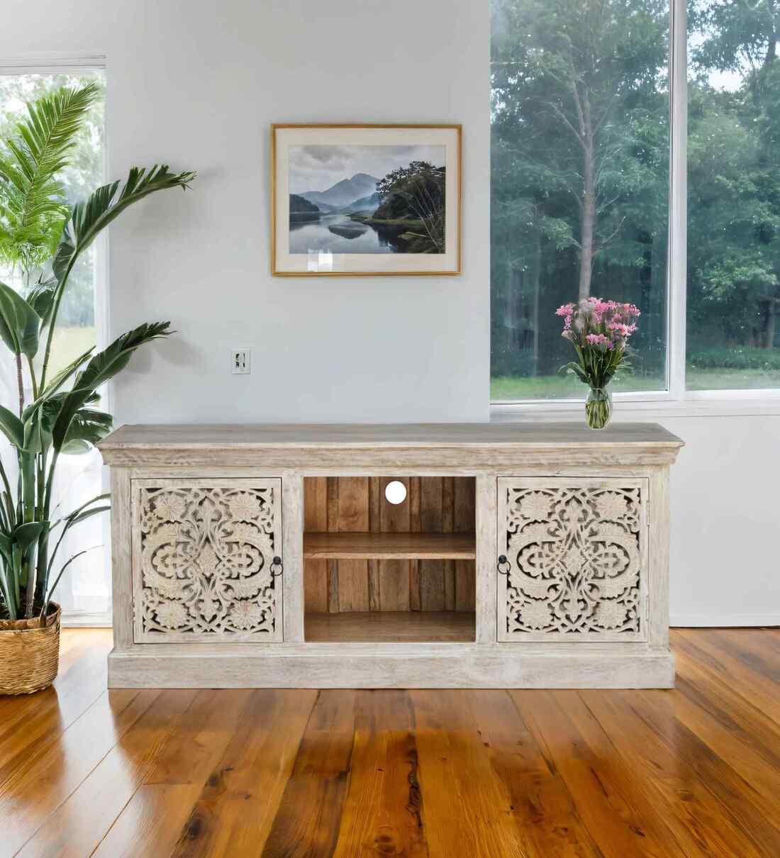 This media cabinet, crafted from solid mango wood, features beautiful hand-carved designs that add a touch of artistry and elegance to your space. The whitewash finish enhances the wood's natural grain, creating a light, airy look. Perfect for living rooms or entertainment areas, it offers ample storage while blending rustic charm with modern functionality.