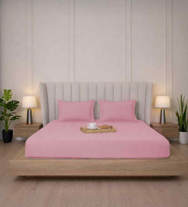 Quarts Pink Stripe 300 TC Pure Cotton King Fitted Bedsheet with 2 Pillow Covers