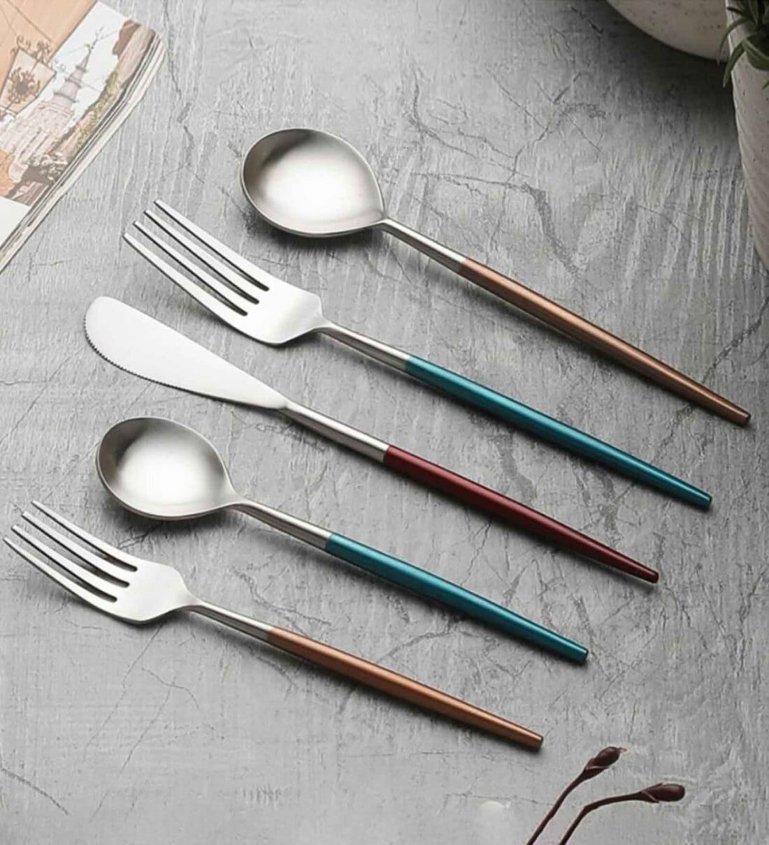 The dining table is a place where we nourish ourselves; where we come together, celebrate important milestones, share experiences, and create new understandings. Make this fulfilling experience even more beautiful, with VarEesha's Radiant range of silverware. This beautiful series has a number of impressive flatware and cutlery. These are made in matt finish stainless steel with beautiful metallic shaded handles that give your home a very classy look. Easy to hold, these are rust proof and have been made with premium quality steel using electroplating. After use, wash them with soft sponge by hand as these are not dishwasher friendly. Radiant Multi-coloured Metallic Handles Matt Finish Stainless Steel Silverware Set has five pieces, that form a complete flatware set - one tea spoon, one table spoon, one salad fork, one table fork and one knife. These are not only sure to add that designer feel to your meal experiences, but are also very unique and lovely gift items. Whether its a loved one's housewarming or a corporate gift occasion, these are just right. Pair them with other pieces from Radiant collection to complete the look. Note - Due to the differences in displays of computers/laptops/phones, the colours on the product you receive may vary marginally from the colours seen on our website.