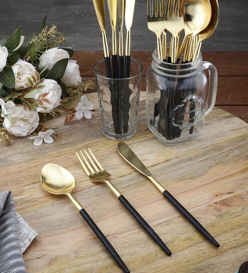 The dining table is a place where we nourish ourselves; where we come together, celebrate important milestones, share experiences, and create new understandings. Make this fulfilling experience even more beautiful, with VarEesha's Radiant range of silverware. This beautiful series has a number of impressive flatware and cutlery. These are made in matt finish stainless steel or electroplated gold with beautiful metallic shaded handles that give your home a very classy look. Easy to hold, these are rust proof and have been made with premium quality steel using electroplating. After use, wash them with soft sponge by hand as these are not dishwasher friendly. Radiant Black Handle Gold Steel Cutlery Set has eighteen pieces - six spoons, six forks and six knives. These are not only sure to add that designer feel to your meal experiences, but are also very unique and lovely gift items. Whether its a loved one's housewarming or a corporate gift occasion, these are just right. Pair them with other pieces from Radiant collection to complete the look. Note - Due to the differences in displays of computers/laptops/phones, the colours on the product you receive may vary marginally from the colours seen on our website.