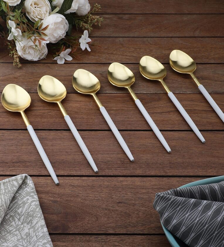 The dining table is a place where we nourish ourselves; where we come together, celebrate important milestones, share experiences, and create new understandings. Make this fulfilling experience even more beautiful, with VarEesha's Radiant range of silverware. This beautiful series has a number of impressive flatware and cutlery. These are made in matt finish stainless steel or electroplated gold with beautiful metallic shaded handles that give your home a very classy look. Easy to hold, these are rust proof and have been made with premium quality steel using electroplating. After use, wash them with soft sponge by hand as these are not dishwasher friendly. Radiant White Handle Gold Steel Table Spoons Set has six pieces. These are not only sure to add that designer feel to your meal experiences, but are also very unique and lovely gift items. Whether its a loved one's housewarming or a corporate gift occasion, these are just right. Pair them with other pieces from Radiant collection to complete the look. Note - Due to the differences in displays of computers/laptops/phones, the colours on the product you receive may vary marginally from the colours seen on our website.