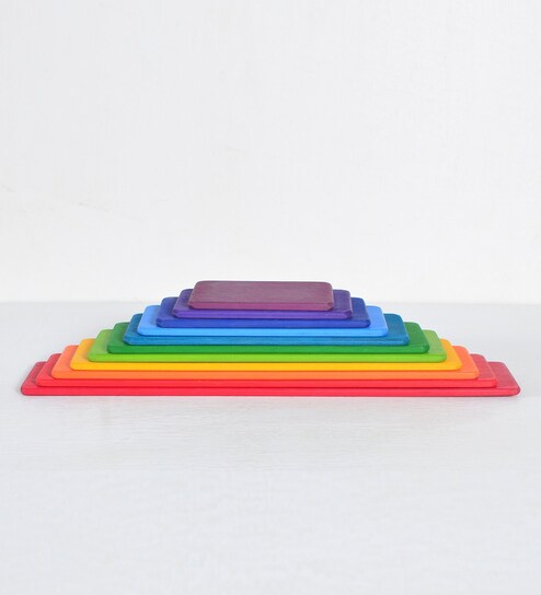 This wonderful solid wood Rainbow Building Boards set is the perfect complement to the 12 piece rainbows, tunnels and opens up a myriad of imaginative play opportunities. The Rainbow Building Boards come with 11 birch ply pieces in a rainbow of colors and varying sizes. Use them as a creative puzzle to be played on the floor, or in combination with our 12 piece rainbow or other building blocks, one can build inventive and flexible dollhouses These slim building boards in a variety of sizes come in handy when building and balancing. The simple flat lengths are a great companion to the 12 piece rainbow. Set includes boards in sizes from 7 x 10 to 36 cm x 0.6 cm and is suitable from 12 months. It is made from Russian Birch ply and naturally stained using non-toxic, water-based color. Minimal colors finish allows the grain of the wood to shine through and ensures that this toy is safe for young children. Children will have hours of endless educational fun with our Heirloom quality Rainbow Boards which fire up their imagination, maybe today they will just make patterns but tomorrow they could be used to build a rocket. Each of our toys is completely designed and handcrafted in our toy shop. Our fun toys are lovingly made using sustainable wood and non-toxic finishes, so they safe for little hands and are sure to be a favorite for many years to come! Just for the natural variation in the wood, each handcrafted toy has its own unique character. Variations in wood grain, color, knots, texture all natural occurrences in these hand-stained wooden products. Each toy will likely vary slightly from the other one but will be equally awesome. Toy Meets the EN71 and ASTM toy safety standards for Europe and America.