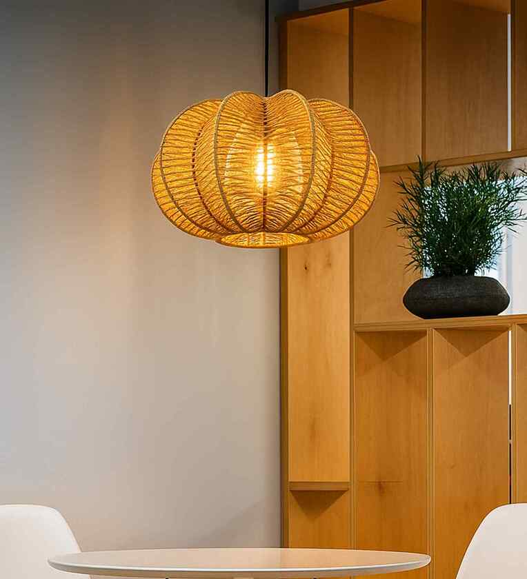 Rattan Seagrass Raffia Kauna Wicker Lamp, Handwoven Pendant, Beige, Round Melon Shape