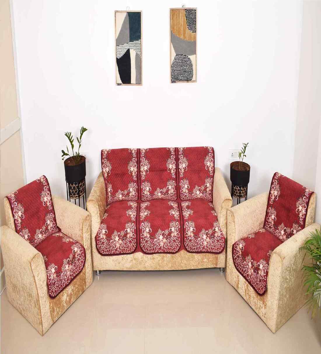 Red 5 Seater Floral 10Pcs Sofa Covers