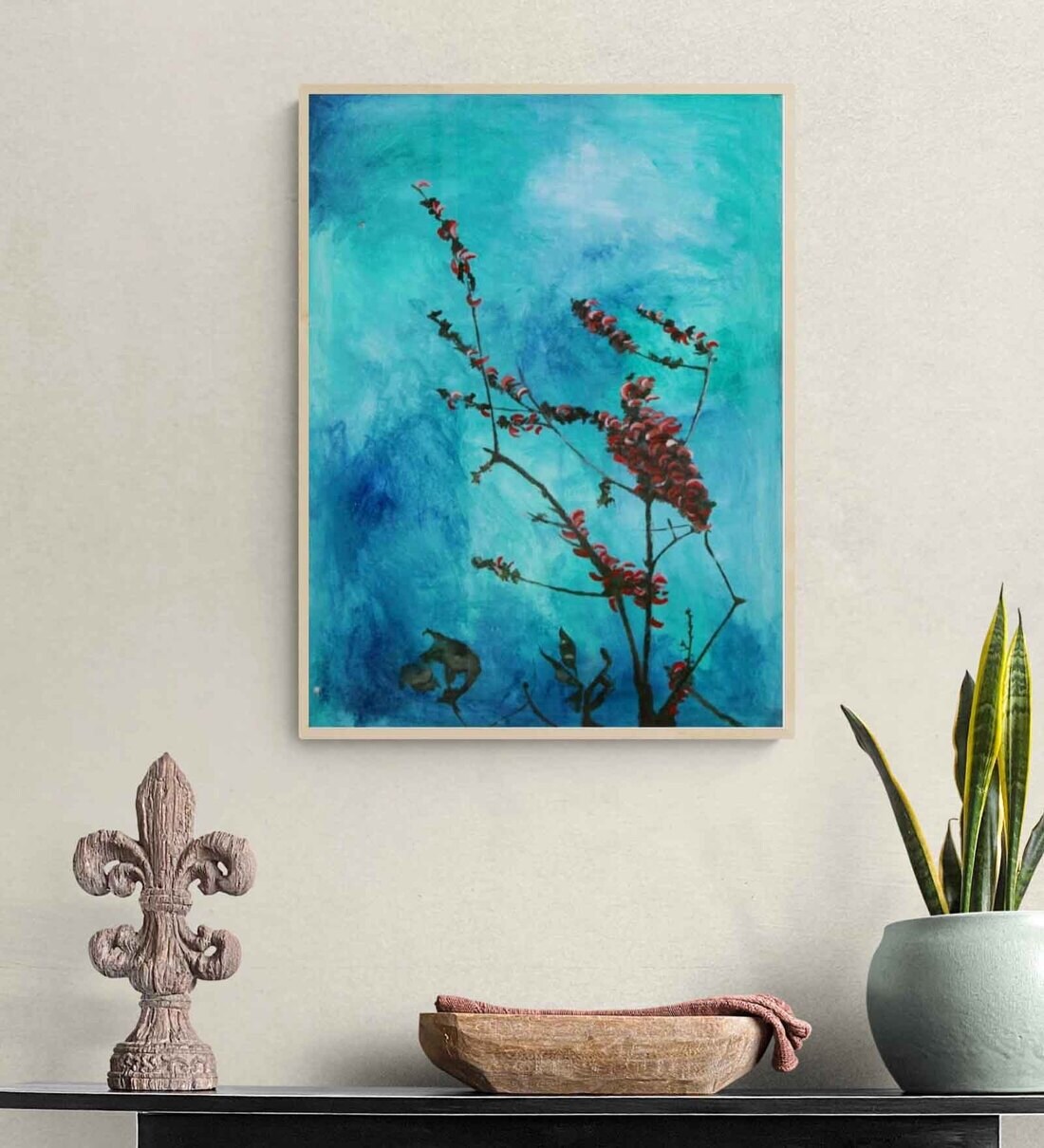 Add meaning to your home & workspace with Atypical Art. The bare branches were silvered with frost. The berries of the holly tree looked white with rime. Old Marie said that all holly berries had once been white, but that the crown of thorns had been made of holly, and the berries had turned red when touched with Jesus's blood. She had a story to explain everything, Old Marie.What you will receive:- Original Artwork without frame- Certificate of Appreciation for empowering an Artist with Disability (shared over email)Expected delivery time: 5-7 business days