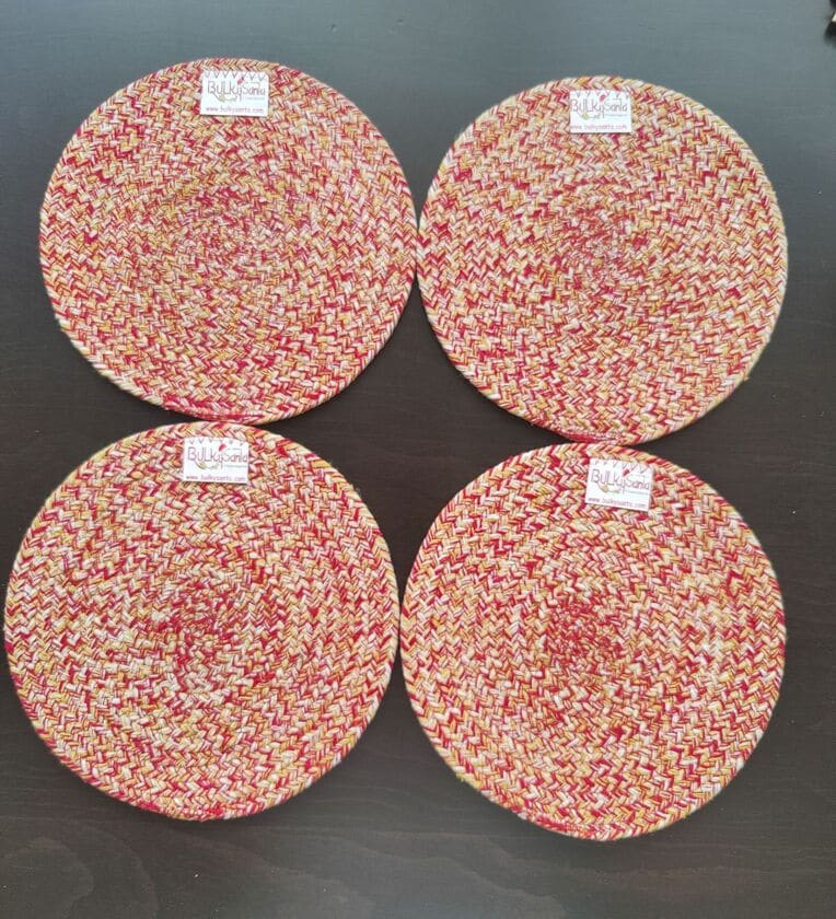 Pack of 4 placemats. Scratch and noise resistant. Reversible Use and machine washable. Useful for hot pans, pots for general decoration like wall d cor. Non-slippery, heat-insulating, colour-fast, odourless, environment friendly. Material Made of high-quality cotton. Shape: Round, Size: 23 cm. Great for daily use or special occasions. These beautiful bulkysanta's placemats or placement mats are eco-friendly and curated with love by our local artisans.